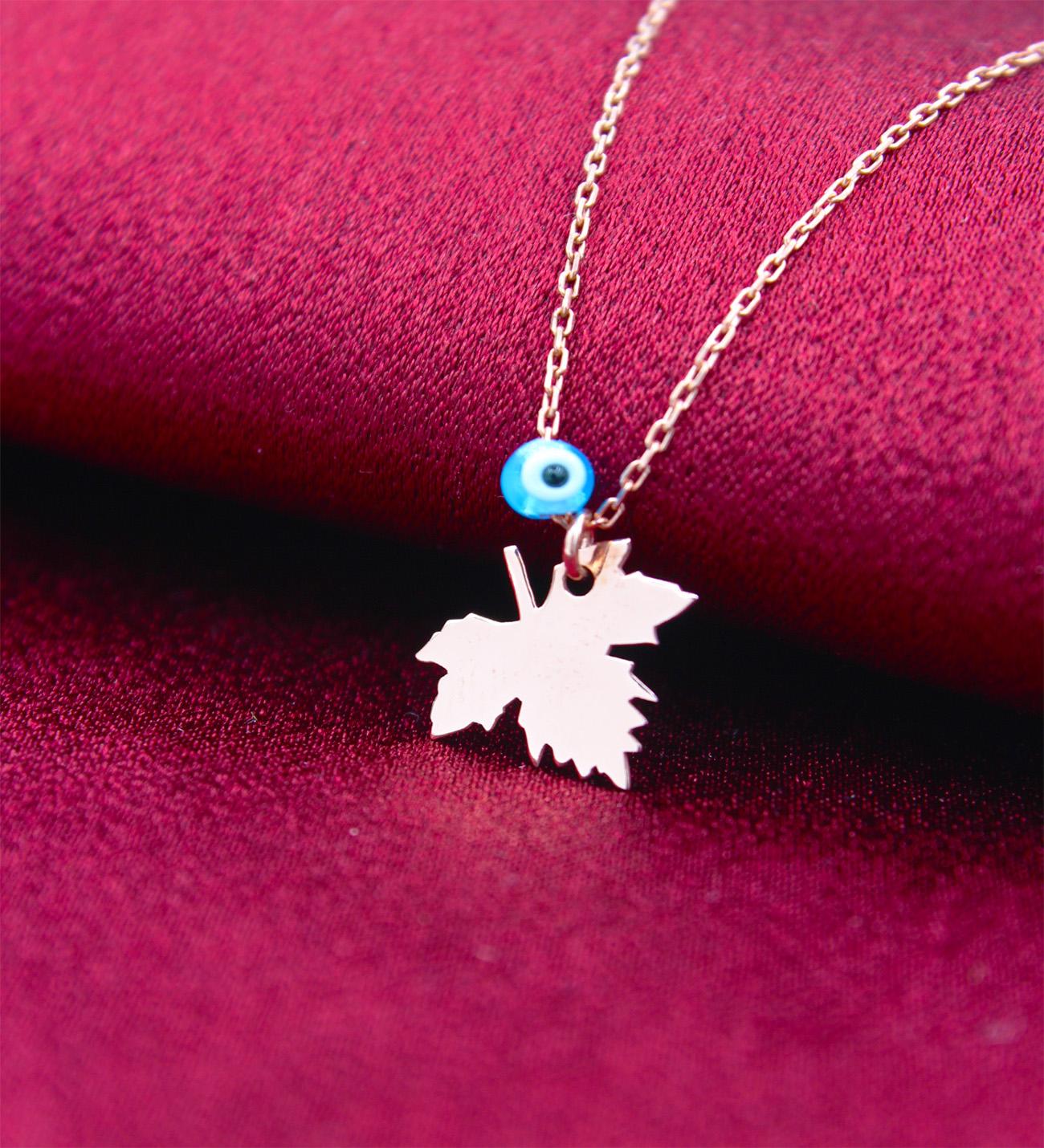 Doğanın zarif dokusunu modern tasarımla buluşturan bu kolye, yaprak figürüyle yenilenmeyi ve umudu, nazar boncuğuyla koruyucu enerjiyi simgeliyor. 14 ayar altın kaplama yüzeyiyle parlak, sade ve şık bir görünüm sunar. Günlük kullanım için ideal olduğu kadar özel günlerde de zarafetinizi tamamlar.