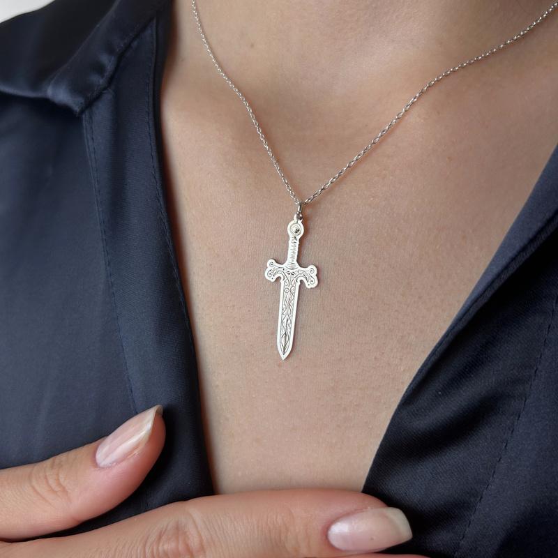 Güç ve stilin sembolü olan Gümüş Tonlu İşlemeli Kılıç Kolye, ince gümüş zinciri ve detaylı oyma kılıç tasarımıyla dikkat çeker. Hem kadınlar hem de erkekler için uygun unisex yapısıyla günlük kombinlere karakter katan modern bir görünüm sunar.