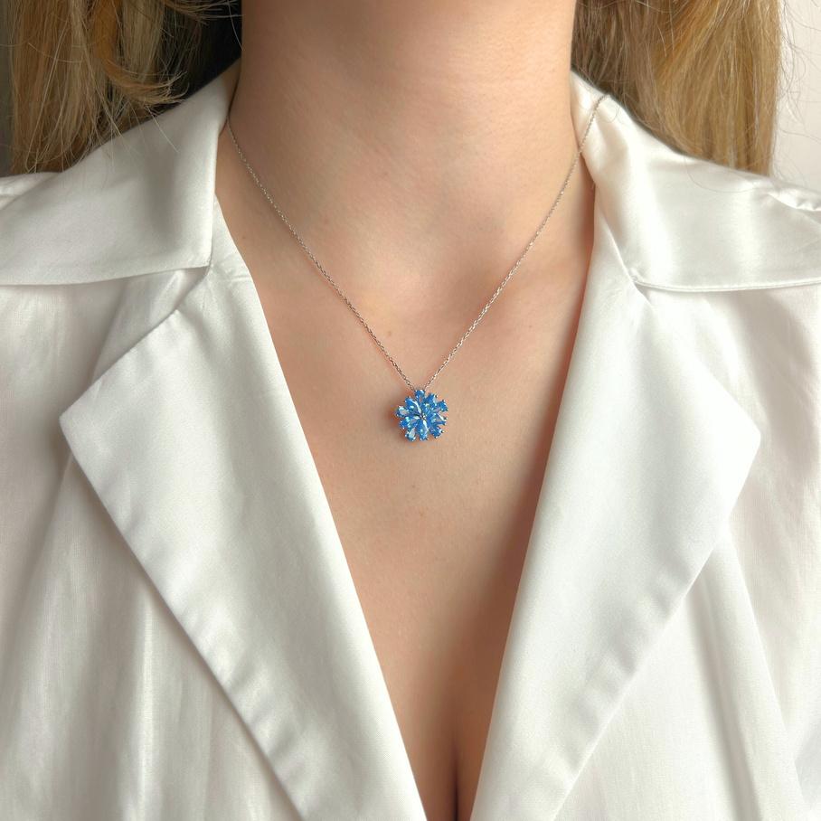 Canlı mavi tonlarıyla dikkat çeken Mavi Taşlı Çiçek Kolye, ince gümüş tonlu zinciri ve ışıltılı kristal çiçek formuyla hem modern hem de etkileyici bir görünüm sunar. Mavi taşın enerjik ve göz alıcı duruşu günlük kombinlerde stilinizi öne çıkarırken, özel günlerde de şık bir tamamlayıcı aksesuar olarak kullanılabilir.