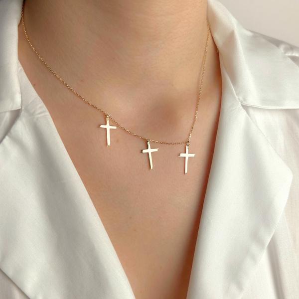 Minimal tasarımın anlamlı detaylarla buluştuğu Üç Haç Figürlü Zarif Kolye, modern görünümü ve sembolik yapısıyla hem günlük hem özel gün kullanımlarında şıklık sunar.