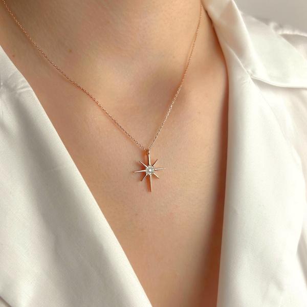 Kolye zinciri ve yıldız formundaki detaylar altın ton kaplama olup uzun süre parlaklığını koruyacak şekilde hazırlanmıştır. Merkezde yer alan taş, ışığı her açıdan yansıtarak boyunda sofistike bir parıltı yaratır.